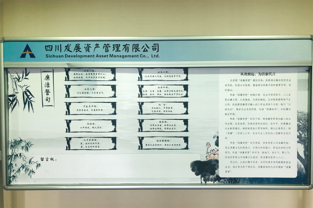 會上,首先由公司黨支部紀檢委員張勇集中展示了向各部門征集的廉潔警句,并宣讀了“從我做起,為清廉代言”的清廉倡議書。為了實現(xiàn)“清廉資管”建設目標,倡議全體員工要爭做“清廉資管”的踐行者、實干家和引領(lǐng)者,共同創(chuàng)造有清明健康的政治生態(tài)、清正有為的干部隊伍、清廉高效的從業(yè)環(huán)境的“清廉資管”。